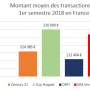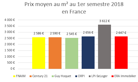 Pour la plupart des organisations qui communiquent à ce sujet, le prix moyen au m² du 1er semestre 2018 en France oscille autour de 2 600€/m² (seul LPI-SeLoger annonce une valeur nettement supérieur, avec 3 612€/m²).