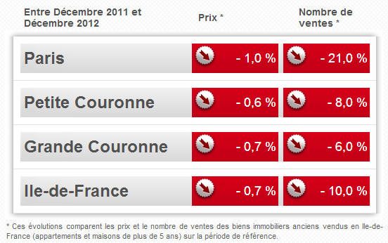 Dans l’ensemble de l’Ile-de-France, les ventes de logements anciens (appartements et maisons) sont en recul 12% sur un an à 128.310 pour l’ensemble de l’année 2012.