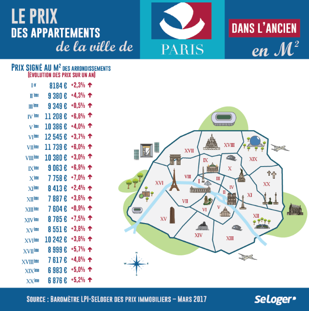Ainsi, Xavier Beaunieux sur le site SeLoger.fr indique que les données compilées par le baromètre LPI-SeLoger, aucun arrondissement parisien, sur les 20 que compte la capitale, ne voit les prix de son immobilier baisser et dans sept d’entre eux, les prix des appartements anciens augmentent au minimum de 5 % sur les douze derniers mois. Dans le XIVe arrondissement de Paris, le m² dans l’ancien voit ainsi son prix littéralement bondir de 7,5 %. Lui emboîtent le pas les Xe (+ 7 %), IXe (+ 6,9 %), IVe (+ 6,8 %), VIIe (+ 6 %), XVIIe (+ 5,7 %) et XXe (+ 5,2 %) arrondissements. C’est dans le IIIe arrondissement que les prix des logements augmentent le plus timidement.