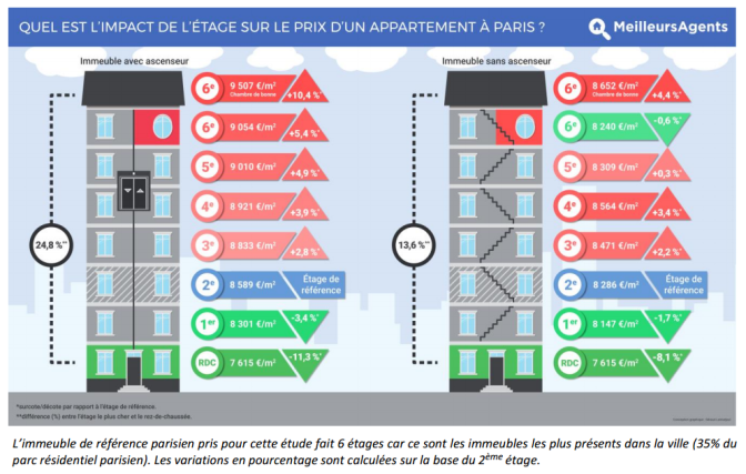 • 19%. C’est la différence de prix du mètre carré entre le RDC et le dernier étage dans un immeuble avec ascenseur à Paris. Cette différence passe à 25% s’il s’agit d’une chambre de bonne au dernier étage.