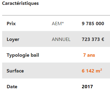 L’immeuble a été acquis pour un montant de 9,8 M€ acte en main et un rendement de 7,41%. Les locataires se sont engagés à payer leur loyer pendant une durée de 7 ans fermes.