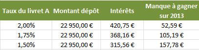 Selon le taux choisi, entre 1,50% et 2%, le montant du manque à gagner, sur les 11 mois restants de l’année 2013, s’échelonne de 52 à plus de 157 € !