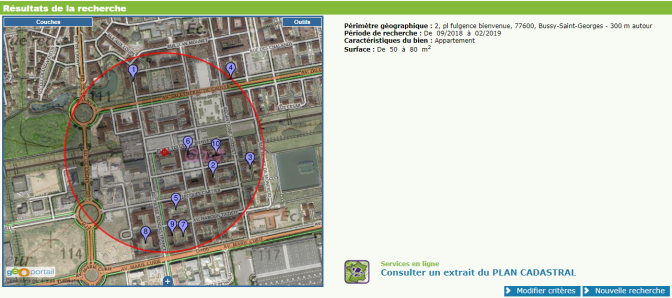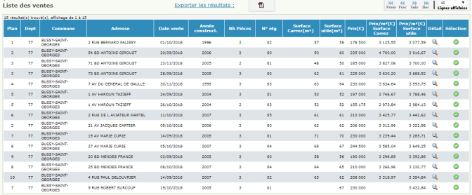 Les résultats présentent le détail de toutes les ventes immobilières correspondant à vos critères : type et superficie du bien, prix de vente, ratio prix / surface, étage et année de construction du logement, adresse et référence cadastrale par exemple.