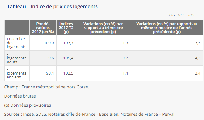 Au deuxième trimestre 2017, les prix des logements augmentent (+1,3 %, en données brutes) par rapport au trimestre précédent. Cette hausse est plus marquée pour les logements anciens (+1,4 %) que pour les logements neufs (+0,7 %).