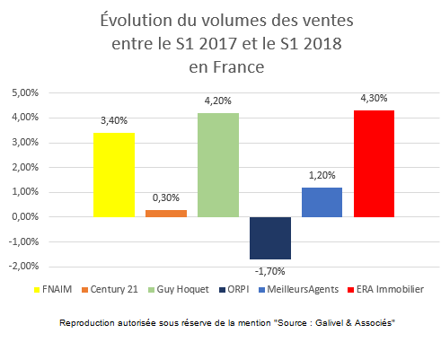 Les différents acteurs du marché immobilier présentent une évolution du volume de ventes assez disparate ! Alors que la FNAIM, Guy Hoquet et ERA Immobilier observent une augmentation respective de +3,4%, de +4,2% et de 4,3%, d’autres observent une stabilisation du marché (Century 21 et MeilleursAgents.com), voire un recul comme ORPI.