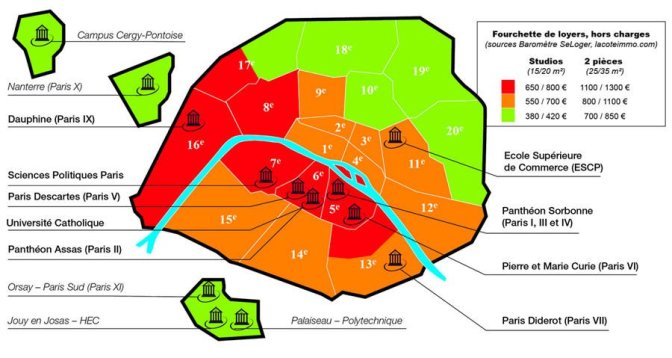 Ce n’est pas une surprise, dans la ville de Paris, profiter d’une proximité immédiate avec son lieu d’enseignement se paye à prix d’or. Et pour cause, les universités et écoles se situent dans les arrondissements les plus chers.