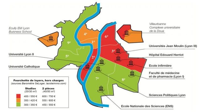 A Lyon, un studio de 15m² se loue 350€, un studio de 30 m², 450€ et un 2-pièces de 45 m² 550€. En s’excentrant, les étudiants pourront gagner 60 € par mois. Sortir de Lyon peut être une bonne alternative, un studio de 35 m² à Oullins, à 6km au sud de Lyon se loue en dessous de 400 €.