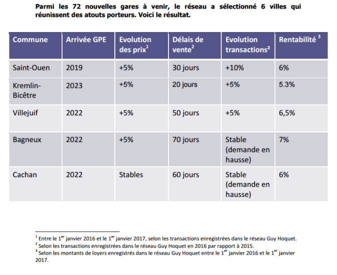 « Même si les prix de l’immobilier ne cessent d’augmenter depuis 10 ans à Paris et en périphérie, il s’agit d’une évolution à long terme. Qui pourrait néanmoins s’accélérer au fur et à mesure du démarrage des travaux. Et si depuis un an, les prix en Ile-de-France ont progressé lentement (de 0,8%, affichant une moyenne de 3 113 euros le m2 ), certaines communes ont vu sur cette même période leur marché prendre de la valeur beaucoup plus rapidement. Celles-là même qui disposent d’atouts non négligeables qui peuvent faire d’elles les futures gagnantes du Grand Paris. Parce que les travaux y sont déjà visibles, que les investisseurs ont déjà commencé à s’y intéresser, et que leurs prix sont encore abordables, ces villes représentent des possibilités intéressantes pour acquérir un bien dans le cadre d’un projet locatif, ou encore s’installer », observe Fabrice Abraham, Directeur Général du réseau Guy Hoquet l’Immobilier.