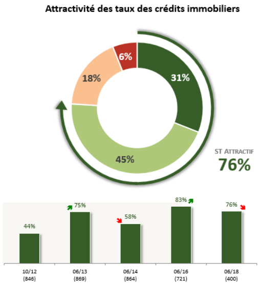 Ainsi, selon l’étude IFOP commandée par la FNAIM sur le moral des Français face au marché immobilier (réalisée du 1er au 8 juin 2018), 76% d’entre eux estiment que les taux proposés par les banques sont attractifs tandis que 56% pensent qu’il est aisé d’obtenir un crédit immobilier.