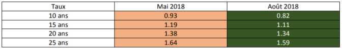 Selon Philippe Taboret, Directeur Général Adjoint de Cafpi, « ce résultat n’a rien de surprenant, car on constate que les taux pratiqués en août 2018 restent très proches des records historiquement bas obtenus à la rentrée 2016 ». Pour rappel, en août 2018, les taux présentés par la météo des taux de Cafpi étaient en baisse :