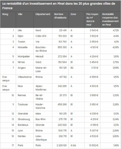 Si l’on ne s’intéresse qu’aux 20 plus grandes villes de France (plus de 145 000 habitants), Lille, dans le Nord, Dijon, en Côte-d’Or, et Toulon, dans le Var, sont les trois meilleures villes pour investir en Pinel neuf, avec des rentabilités de 4,7% pour la première et de 4,1% pour les deux suivantes.