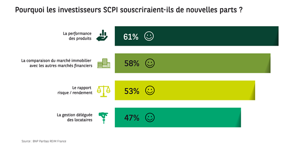 Quatre autres critères constituent en revanche des critères motivants pour les associés. C’est le cas du rapport risque/rendement, perçu comme une motivation par 53% des associés (contre 21% comme un frein). La performance des produits pourrait elle aussi inciter les répondants à souscrire de nouvelles parts (61%), tout comme la gestion déléguée des locataires (47%) et la comparaison du marché immobilier avec les autres marchés financiers (58%).