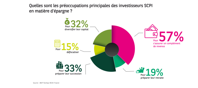 A la question « quelles sont vos préoccupations principales en matière d’épargne ? », l’objectif n°1 des associés est de s’assurer un complément de revenu (57%). Dans un deuxième temps, 33% souhaitent préparer leur succession et 32% diversifier leur capital. Enfin, 19% des souscripteurs interrogés cherchent à préparer leur retraite et 15% d’entre eux ont pour objectif de défiscaliser.