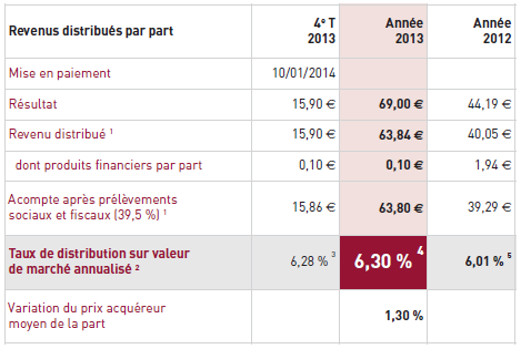La SCPI était investie à hauteur de 134 % des fonds en jouissance au 31/12/2013, se traduisant par des fonds investis supérieurs à la collecte en jouissance. Le taux de rendement [a[immobilier]a] « acte en mains » des investissements réalisés est en moyenne de 8,20 %.