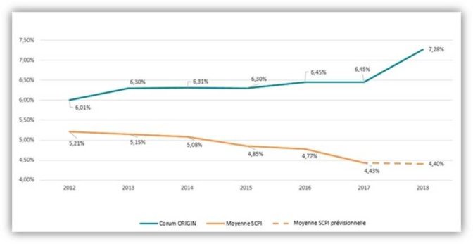 CORUM Origin a réalisé, pour la septième année consécutive depuis sa création, un rendement supérieur à son objectif annuel de 6%. Avec 7,28% de rendement annuel (6,45% en 2017), la performance de CORUM Origin est à son plus haut historique et la plus importante pour une SCPI « zone euro ». Cette performance se décompose ainsi :