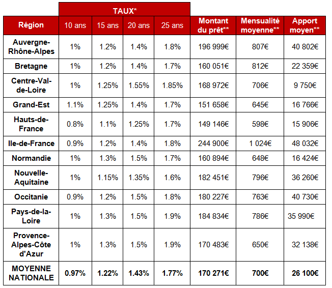 Concernant l’analyse par région, les taux sont homogènes sur l’ensemble du territoire. La plupart des régions ont vu les taux se stabiliser. On constate cependant une légère baisse de 0,1% à 0,15% sur la région Hauts-de-France sur 10, 15, 20 ou 25 ans.