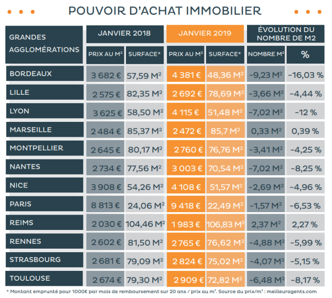 Le marché de l’immobilier reste également stable. « Avec des taux qui restent bas et des prix qui évoluent peu, le pouvoir d’achat immobilier n’a quasiment pas changé depuis le début de l’année, pour un prêt sur 20 ans avec une mensualité de 1 000 €, le prêt se monte à 211 846 € », ajoute Philippe Taboret. Cette somme correspond à l’achat de 48,36 m² à Bordeaux, 51,48 m² à Lyon, 22,49 m² à Paris ou encore 72,82 m² à Toulouse.