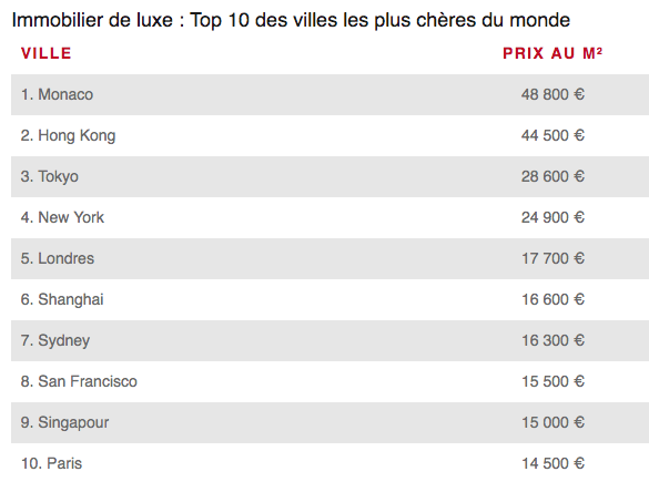 New-York n’arrive qu’en 4e position du TOP 10 des villes les plus chères au monde. Avec un prix moyen au mètre carré de €, Occupant un espace plus petit que Central Park à New York, Monaco accueille 38.000 habitants originaires de 139 pays différents. « Nous avons constaté une augmentation notable de la demande des acheteurs britanniques, moyen-orientaux, turcs et grecs au cours de 2018. », a déclaré Irene Luke, directrice de Savills Monaco. « Monaco jouit d’une réputation inégalable parmi les grosses fortunes internationales » ajoute Sophie Chick, directrice World Research de l’entreprise. La Principauté est également le marché le plus cher pour la location d’immeubles résidentiels de luxe avec une valeur locative moyenne de 1 200 € par m².